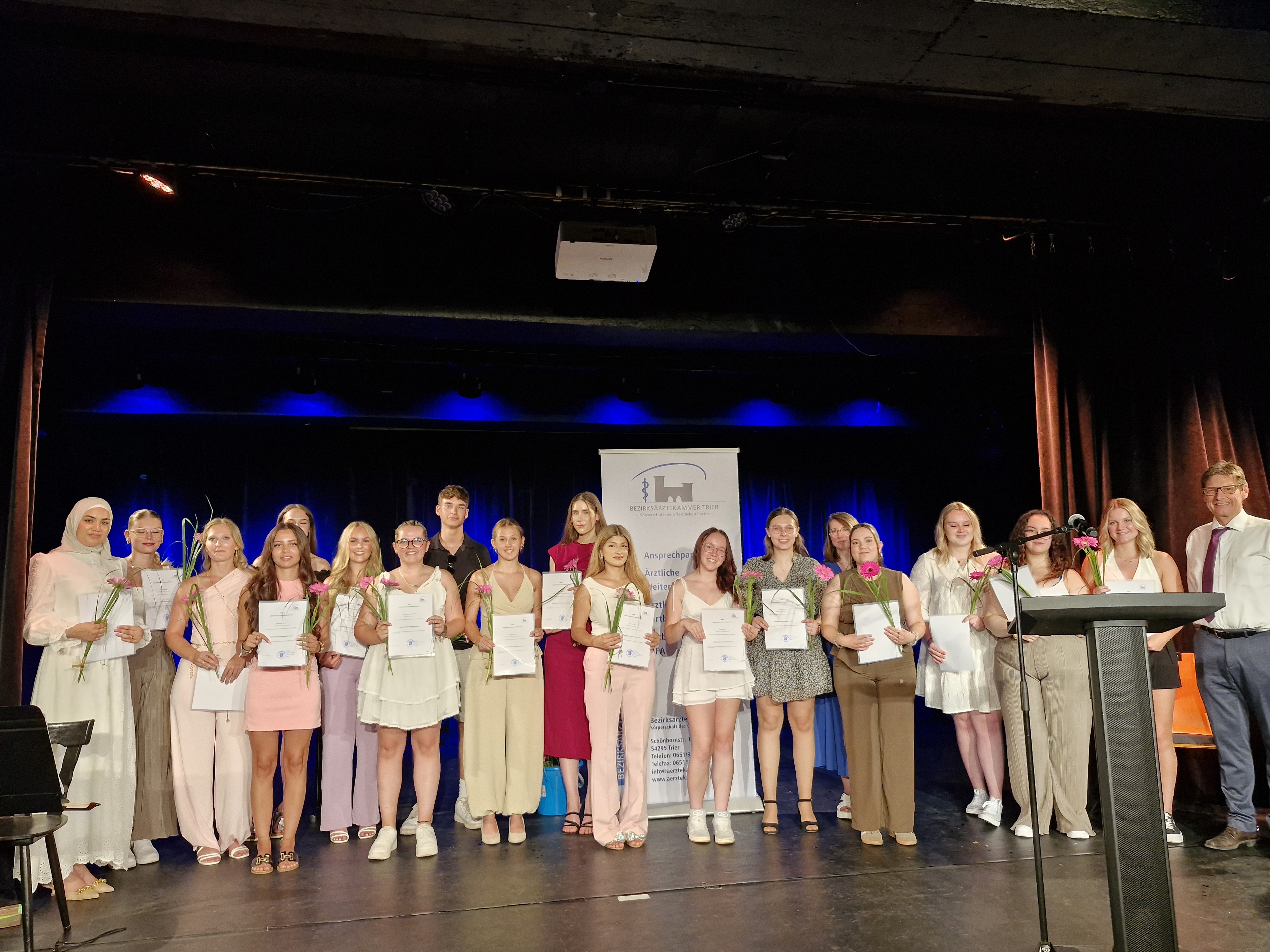 Herr Dr. med. Gradel sprach zudem seinen ausdrücklichen Dank gegenüber Herrn Fritzen sowie Frau Dr. med. Eckert-Piro aus, beide tätig an der BBS für Wirtschaft Trier, für die erstmalige Durchführung des Prüfungsvorbereitungskurses an unserer Einrichtung. Dieser trug in erheblichem Maße dazu bei, den Absolventinnen die Furcht vor der praktischen Prüfung zu nehmen